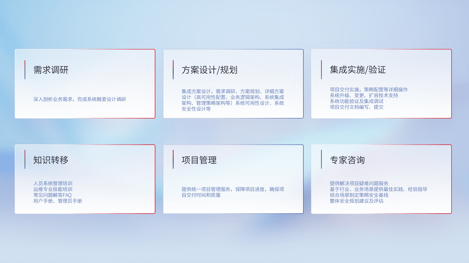针对客户行业特性,,将宏观的安全战略和需求,,,通过专业的交付服务,,,,实现项目落地,,,,为客户提供标准规范的集成交付服务。。。